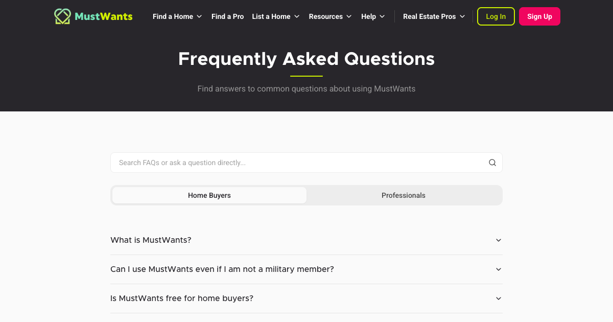Frequently asked questions about MustWants. Learn how our platform helps military families find homes and connect with professionals.